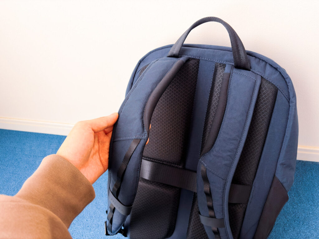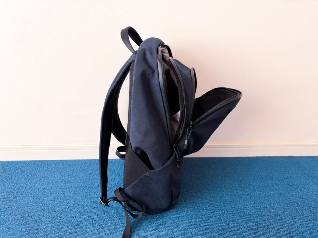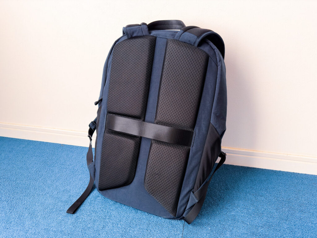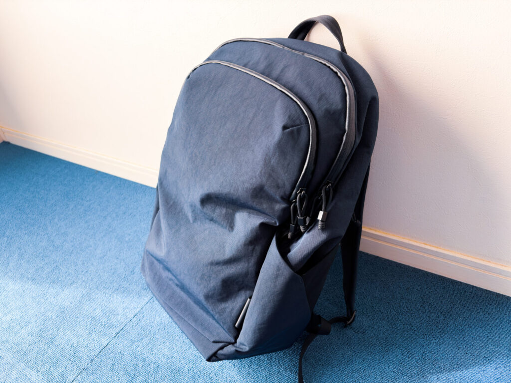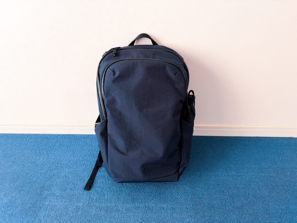 というのも、近年のテック系バックパックと比較すると、見た目は細めで、メッシュ素材も採用されていないからです。