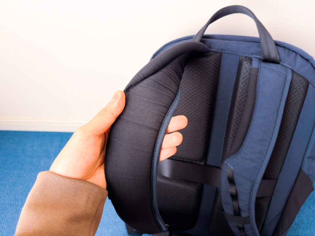 ベルトは細めではあるものの、そのぶん肩へのフィット感が抜群。さらに、コシのある高密度クッションが入っているため、肩への負担も思っていた以上に少なく感じました。