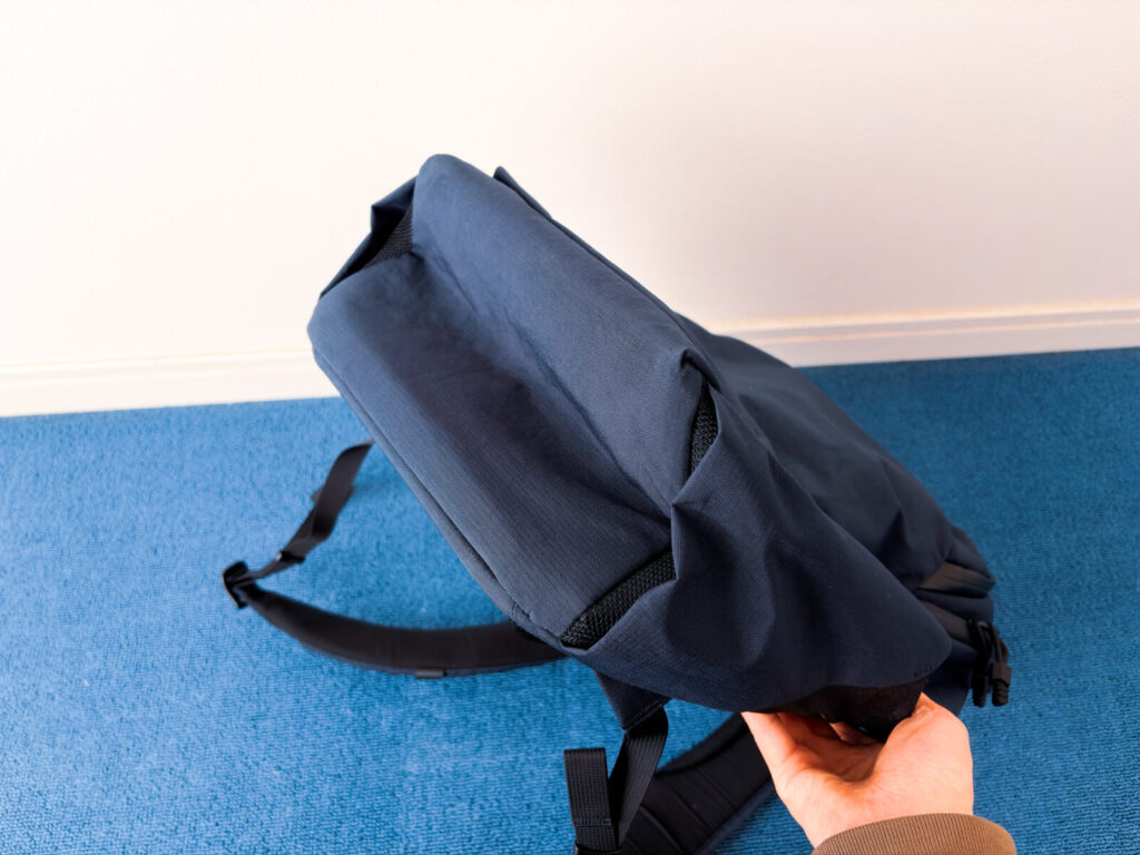この設計により、ある程度の荷物を詰めていても底面が膨らまず、バックパック全体のシルエットを薄く保てます。