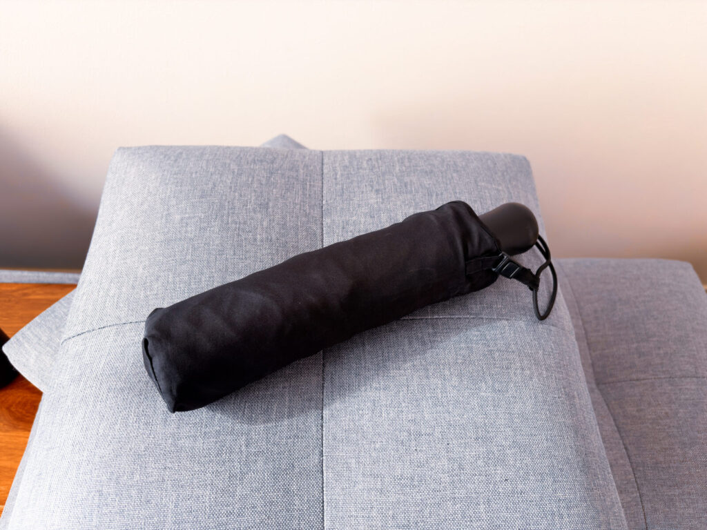 ユニクロのUVカットコンパクトアンブレラは、コンパクトサイズかつ、収納袋をストラップで留められるのが便利です。